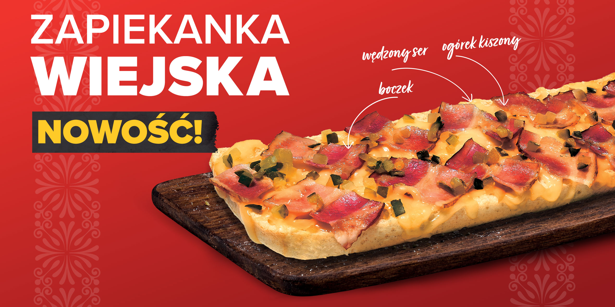 Nowa zapiekanka Wiejska, przygotowywana jest na pszennym pieczywie i łączy swojski boczek, ogórka kiszonego, sos chrzanowy oraz dwa rodzaje sera – wędzony i goudę. To kompozycja inspirowana kuchnią domową, wyrazista i sycąca, idealnie wpisująca się w zimowe menu. Produkt dostępny jest również w wersji z dodatkami, takimi jak sałatka szwedzka lub cebula prażona.