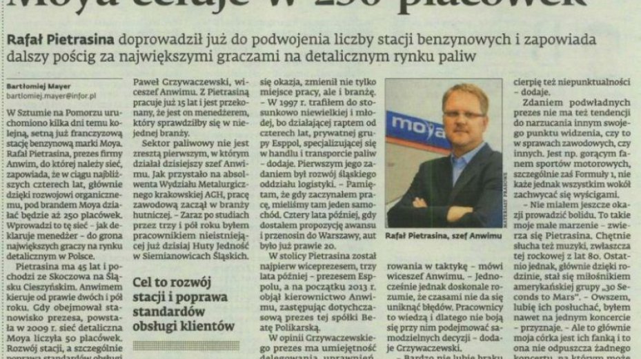 Poniedziałkowy Dziennik Gazeta Prawna prezentuje sylwetkę Rafała Pietrasiny, prezesa spółki Anwim. Publikacja porusza także temat planów ekspansji sieci Moya.