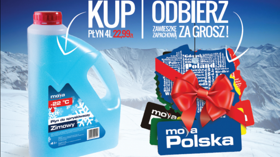 Każdy klient stacji w sieci MOYA, który zakupi zimowy płyn do spryskiwaczy marki własnej, w opakowaniu czterolitrowym, otrzyma za symboliczny grosz zawieszkę zapachową.