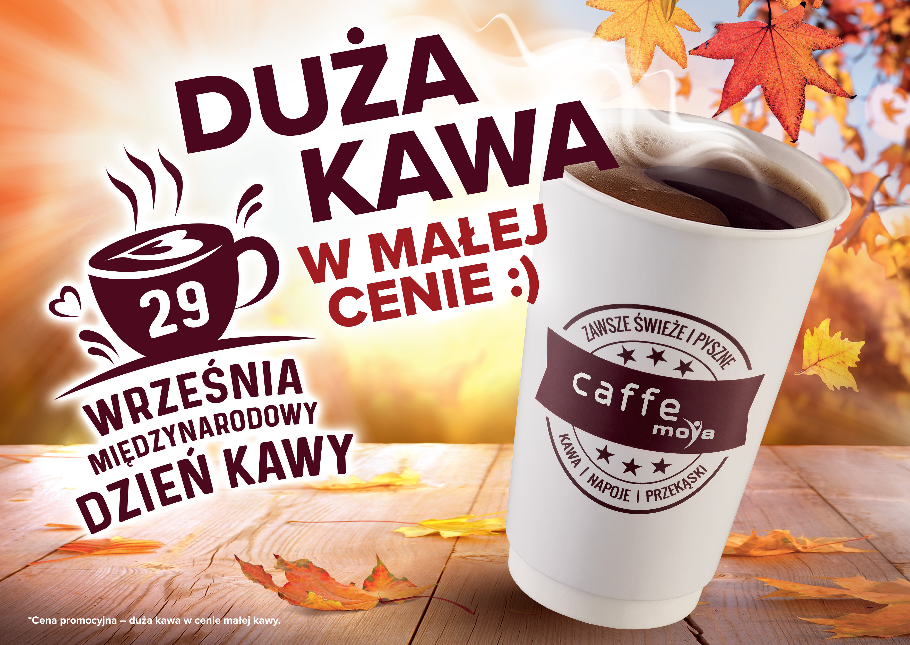 Tradycyjnie, jak co roku, podczas Międzynarodowego Dnia Kawy, który przypada 29 września, w Caffe MOYA, na klientów czekają specjalne promocje. Tym razem klienci mogą rozkoszować się tym energetyzującym napojem w niższych cenach, ponieważ za dowolną dużą kawę zakupioną tego dnia w Caffe MOYA zapłacimy jak za małą.
