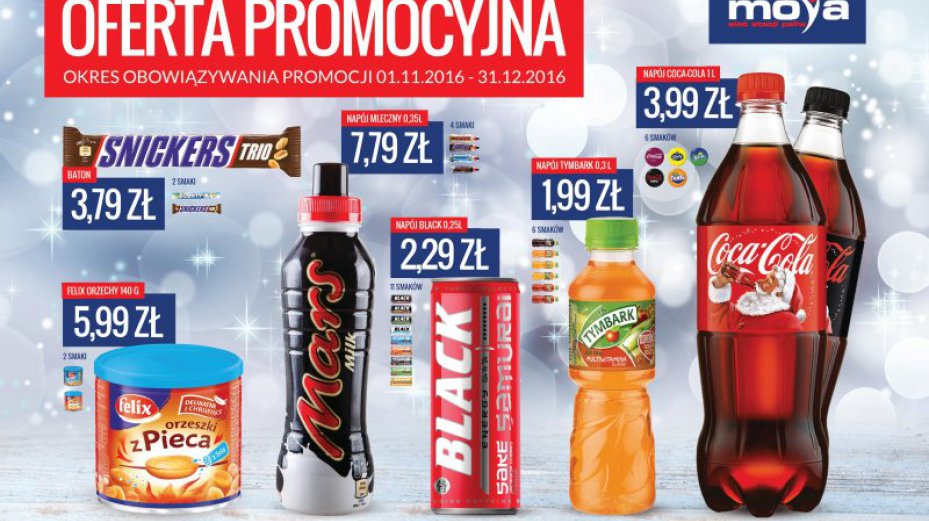 W bieżącej ofercie znalazły się napoje z portfolio Coca-Coli, energetyki BLACK, soki Tymbark oraz nowość w Polsce - napoje mleczne o smakach kultowych batonów Mars, Snickers, Bounty i Twix. Promocję uzupełniają powiększone batony Mars i Bounty TRIO oraz orzeszki felix.