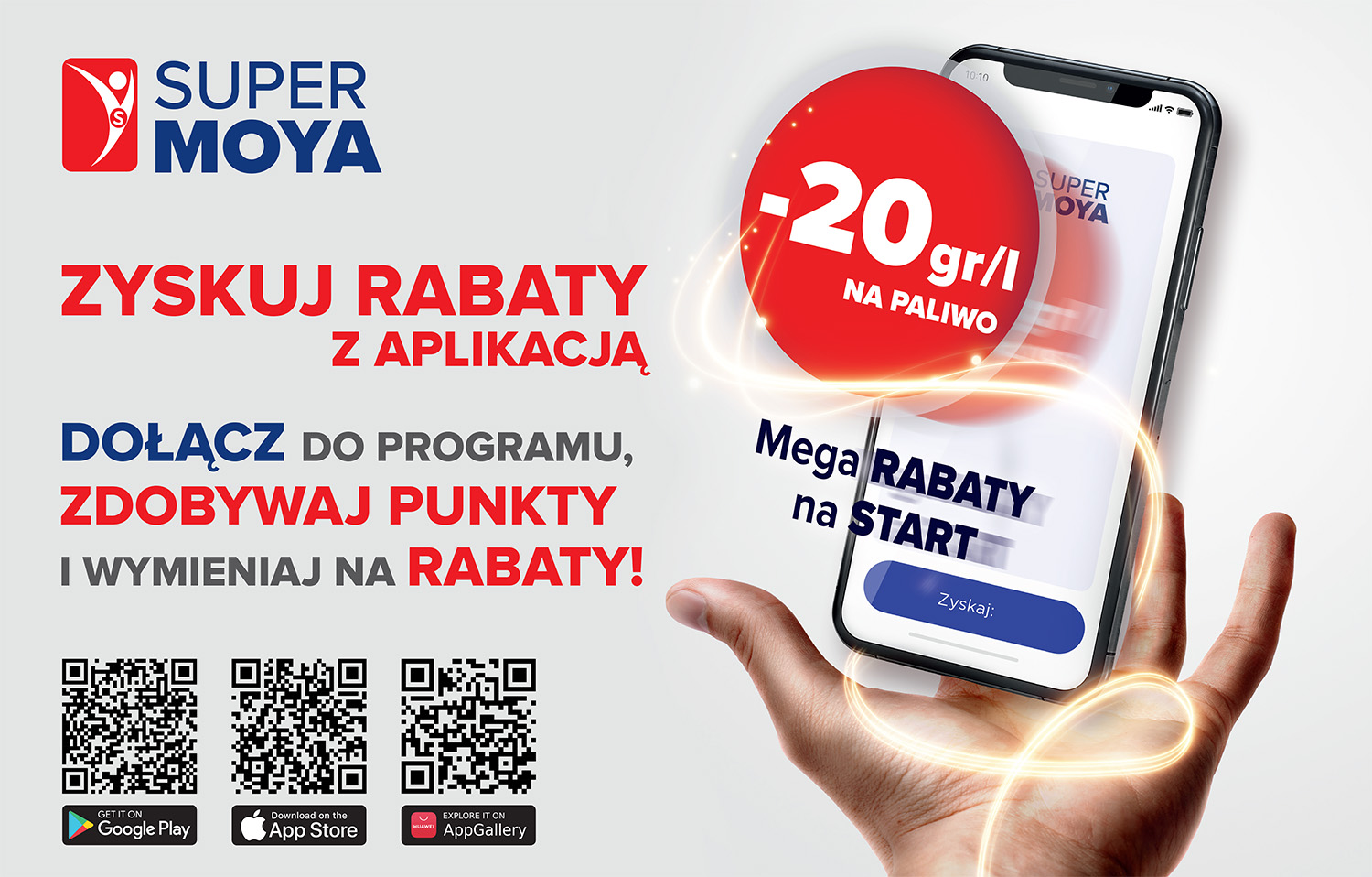 Aplikację Super MOYA można pobrać za darmo na urządzenia z systemem iOS i Android bezpośrednio ze sklepu na telefonie lub wejść na stronę www.supermoya.pl i wybrać opcję odpowiednią dla danego urządzenia. Na stacjach paliw znajdują też plakaty z QR kodem, który po zeskanowaniu przekieruje użytkownika na stronę z linkami do instalacji aplikacji. Rejestracja jest szybka i prosta.