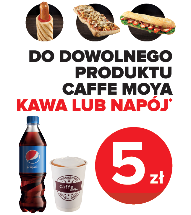 Stacje MOYA zapraszają na wyjątkową promocję! Od 27 października do 5 listopada, do dowolnego produktu z oferty gastronomicznej Caffe MOYA możemy dokupić kawę lub napój Pepsi za jedyne 5 zł*.